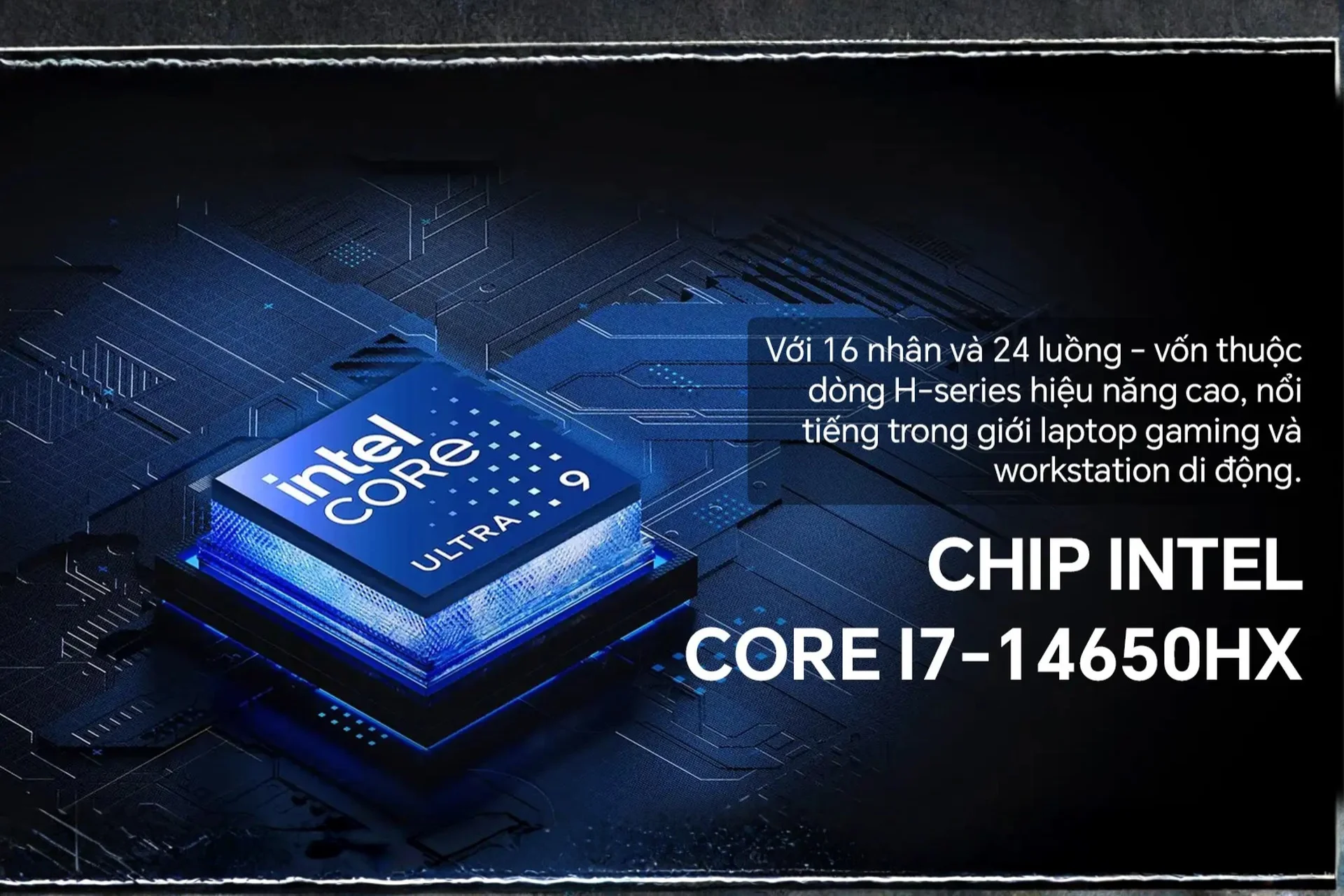 - CPU: Intel Core i7-14650HX (16 nhân, 24 luồng, xung nhịp tối đa 5.2GHz)